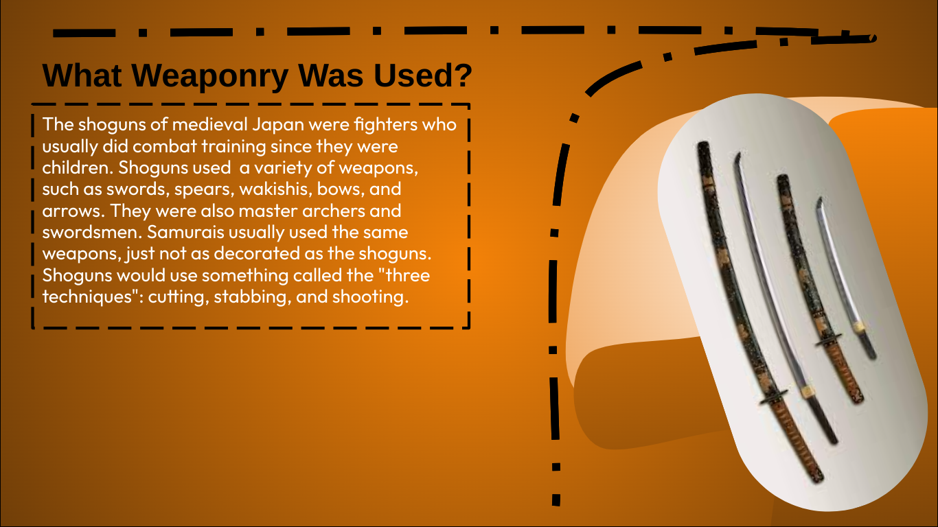 The shoguns of medieval Japan were fighters who usually did combat training since they were children. Shoguns used a variety of weapons, such as swords, spears, wakishis, bows, and arrows. They were also master archers and swordsmen. Samurais usually used the same weapons, just not as decorated as the shoguns. Shoguns would use something called the "three techniques": cutting, stabbing, and shooting.